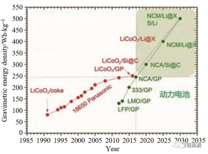 圖2 1990—2025年鋰離子電池能量密度發展路線