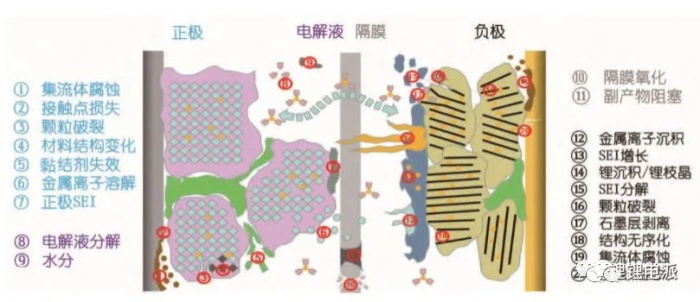 例如,正極材料因局部Li+脫嵌速率不一致導致材料所受應力不均而產生的顆粒破碎,硅負極材料因充放電過程中發生體積膨脹收縮而出現的破碎粉化,電解液受到濕度溫度的影響發生分解或變質,石墨負極與電解液中添加劑的碳酸丙烯酯(PC)發生的溶劑共嵌入問題, N/P(負極片容量與正極片容量的比值)過小導致的析鋰。