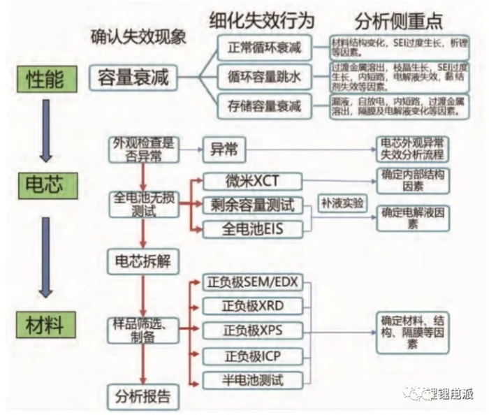 以容量衰減電池失效分析為例(如圖4所示),結合失效表現和使用條件細化失效行為,并提供相應分析側重點。如正常循環衰減,則后期分析注重于材料結構變化、SEI過度生長以及析鋰等因素。