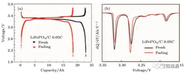 圖5 某款LiFePO4/C失效電池和新鮮電池全電池(a)充放電曲線及(b)對應放電曲線的IC曲線