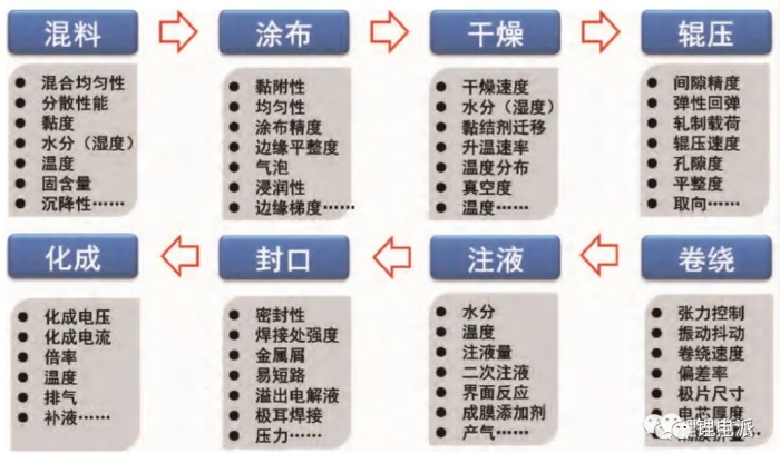 圖9展示了鋰電池常見的制備過程,圖中描述了各個生產過程中存在的影響電池使用性能的因素