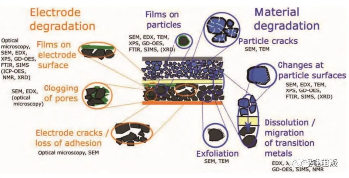 某一個失效現象可能對應著多種失效原因,例如容量衰減究其失效機理有材料結構變化、微結構破壞、材料間接觸失效、電解液失效或分解、導電添加劑失效等。