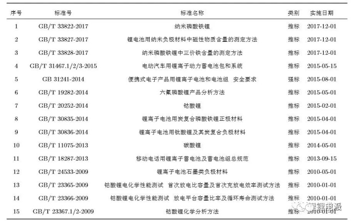 國內現行多款測試分析標準,多數以材料為出發點,涉及材料性能和含量的測定方法, 如表1所列。此外, 針對電池組和電池包的 GB/T 31467《電動汽車用鋰離子動力蓄電池包和系統》, 以及針對單體電池制定的GB/T 18287《移動電話用鋰離子蓄電池及蓄電池組總規范》包含了部分安全檢測和性能指標。