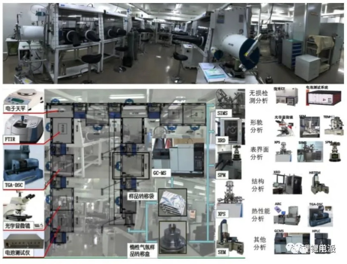 在中國科學院先導A類項目資助下, 依托物理研究所多年累積的鋰離子電池研究,搭建了互聯互通惰性氣氛電池綜合分析平臺,圖13展示的是中國科學院物理研究所互聯互通惰性氣氛綜合分析平臺CAFFES,為國內外優秀電池企業提供診斷分析服務,與科研院校及材料企業合作開展商業電池和先進電池的失效機理研究,以及失效分析方法的研究,力求建立與完善鋰離子電池失效故障樹和失效分析流程,完善鋰電池整體失效分析體系。
