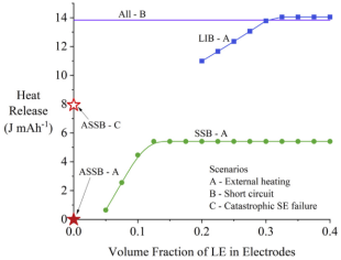 失效模式A下,添加少量LE的SSB比ASSB產生的熱量更多,但仍比LIB少得多。對于SSB,當體積分數高于0.125時,正極產生的O2已經與LE反應完全,形成一個平臺。由于LE與負極Li反應,所以LIB的體積分數在0.3時上會有一個平臺。值得注意的是,由于NMC的氧損失是吸熱的,當LE的體積分數小于0.08時,熱釋放可忽略。其它失控模式下,ASSB和SSB并不比LIB更安全。短路失效模式在ASSB、SSB和LIB中的熱釋放是相同的。失效模式C下,反應的熱釋放可能是巨大的。